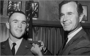 George H.W. Bush pins a lieutenant bar on his son, George W. Bush, in 1968