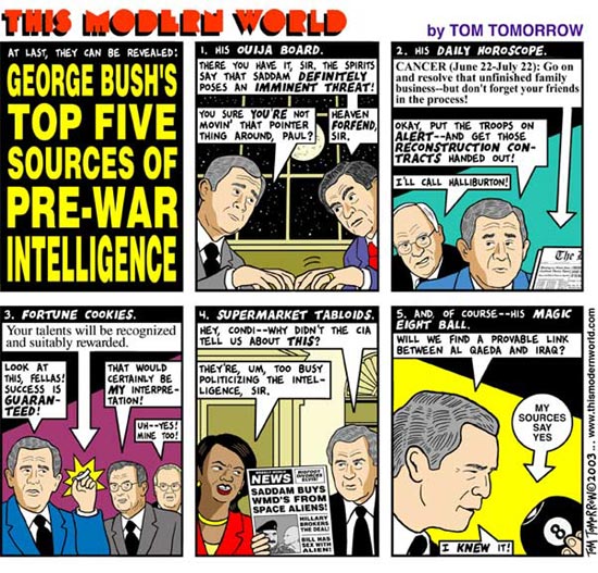 Tom Tomorrow cartoon of 8/11/2003 illustating how we got intelligence on Iraq.