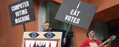 In California, 50 TrueMajority members filled a Sacramento sidewalk last week calling for accountability from paperless electronic voting terminals. It was a fun event -- our "hungry computer" prowled around for votes to eat and TrueMajority balladeer Laramie Crocker sang his ode to paperless voting, "Little Black Box," while the crowd urged state officials to dump California's unverified voting machines. The very next day California's Voting Systems and Procedures Panel said that's exactly what should be done. The panel recommended to California Secretary of State Kevin Shelley that he revoke the certification of the model TSx paperless electronic voting machine, made by Diebold Election Systems.