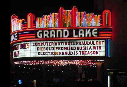 • Diebold's new touch screen voting machines have no paper trail of any votes. In other words, there is no way to verify that the data coming out of the machine is the same as what was legitimately put in by voters.