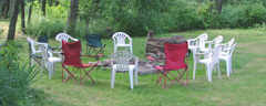 Behind the house, at the edge of the woods, there is a large fire circle, ringed with lawn chairs. A small altar has been set up to honor the four directions and the four elements. On the east side of the altar is a feather, to symbolize the element of air. To the south, a lit candle symbolizing fire. To the west, a shell to symbolize water. To the north, a stone symbolizing earth.