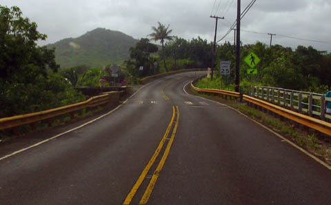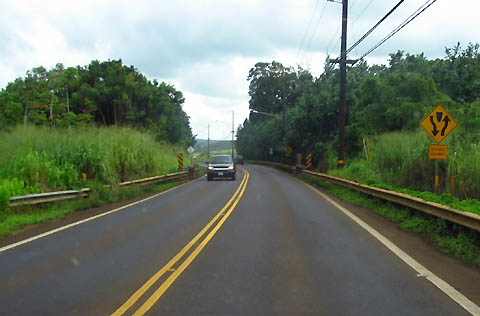 Bottleneck A: Approaching bridge with guardrails east of Lawai. Note "safety" area narrows to nothing