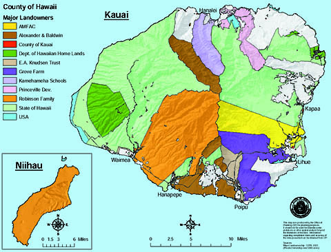 Major property owners on Kauai as provided by the Hawaii State DBEDTNote that between Waimea and Lihue there are only four significant property owners (with the exception of Kalaheo). If the Robinson Family (orange), Alexander & Baldwin (brown), E A Knudsen Trust (tan) and Grove Farm (purple) could agree to letting bikes on their canefield roads a lot could be accomplished.