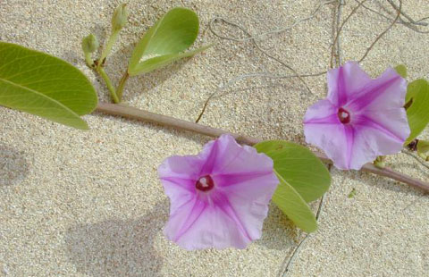 The purple or pink morning glory flowers are trumpet shaped and lie close to the ground. The flower petals open only in the cooler morning hours. The leaves are 2-3 inches long, double-lobed, leathery, and shaped like a goat's foot. The vine often grows right down to the high tide line.