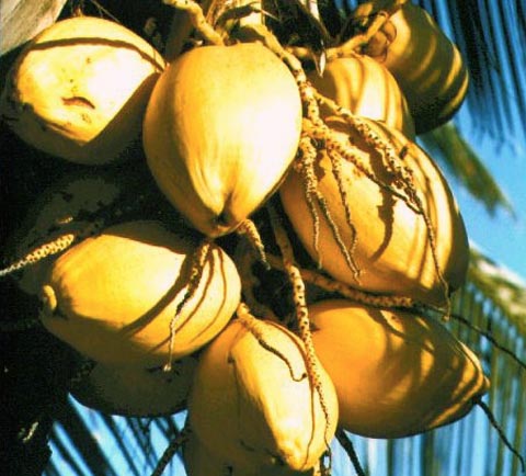 Green coconuts are picked for their water. One coconut contains about a quart of water encased in a hard nut, then a fibrous husk. When the coconut is yellow or brown, it will drop from the tree. It still contains some water, and some soft white meat. The water and meat are mixed to make coconut milk, which is commonly used here in cooking. Haupia is thickened soft coconut meat cooked into a pudding. Coconut oil can be extracted from dried coconut meat.