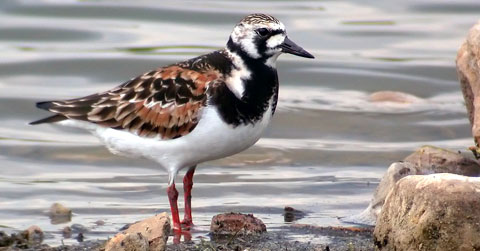 The ‘Akekeke, or Arenaria interpres, is about 9 inches song, and has red legs and a black bill which is slightly upturned at the tip. During the winter months, they have brown backs, white below, and a black bib on the neck. In flight, you will see a black and white pattern on wings, back and rump.