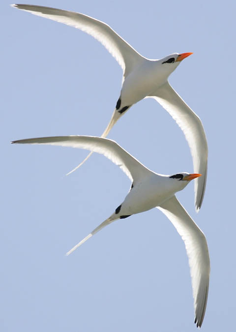 Pairs of Tropicbirds engage in aerial acrobatics during breeding season, and remain together for years. Breeding season is March through October, and one egg is lain in a nest. The nest is built by scraping out a depression in a cavity, ledge or cave on a steep cliff face. Both parents take turns sitting on the egg and feeding the baby bird. Nests are threatened by cats and rats, predators which were introduced to the Hawaiian islands.