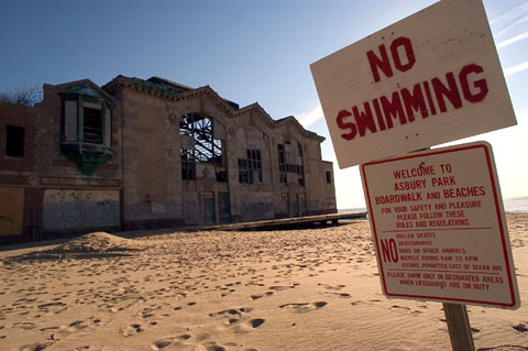 image above: Asbury Park, NJ, beach with no swimming sign. Photo by Bill Blanchard