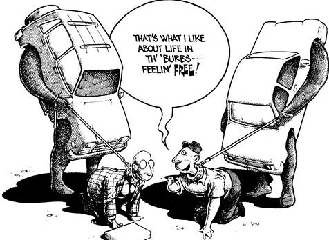 I was at a policy meeting of the U.S. Dept. of Transportation in or around 1990 for a small public meeting on car and traffic issues. What struck me there was that lobbyists from industry got away with saying for the feds, "So, the car and its traffic and infrastructure work well most of the time, except two times a day (rush hours)." That’s the way they want to frame any debate: cars are fine, although they can stand a little tinkering. During that same meeting, when I said I worked toward a national paving moratorium, one jaded old car-industry lobbyist grinned at me like he relished the extremely unlikely consideration due my concept.