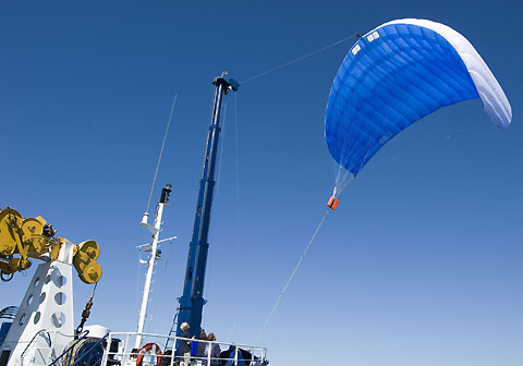 image above: Commercial Ship deploys SkySail computer coordinated towing technology