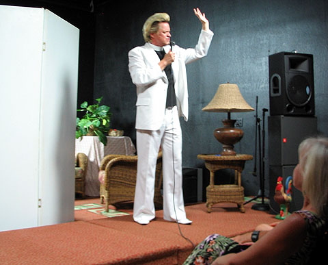 image above: Reverend Billy preaching on the Stage of The Storybook Theatre of Hawaii 8/1/20007