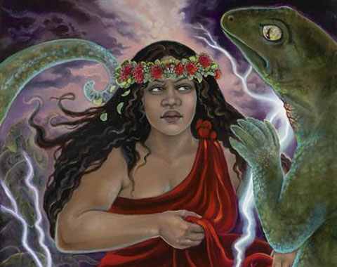image above: detail of painting Hi'iake and the Mo'o by Linda Rowell Stevens www.lindaspaintings.com