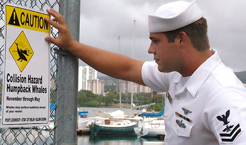 on "Caution!" signNavy illustrates danger to ships & sailors after collisions with humpback whales