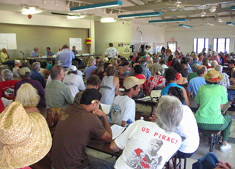 Rich Caldarone, a resident of Kailua, Kona, told the Superferry critics in the audience at Kealakehe High School that they are kidding themselves if they think they can stop people from coming to the Neighbor Islands by blocking the Superferry. He pointed out the window of the school cafeteria toward the coastline plied by cruise ships to make his point.