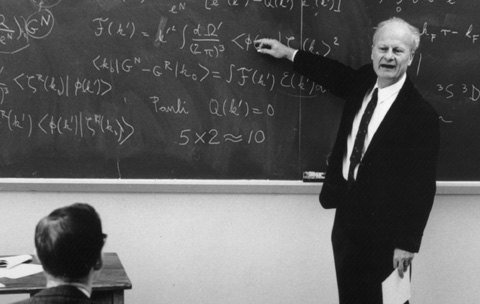 Hans Bethe (1906-2005), winner of 1967 Nobel prize in physics at the blackboard.
