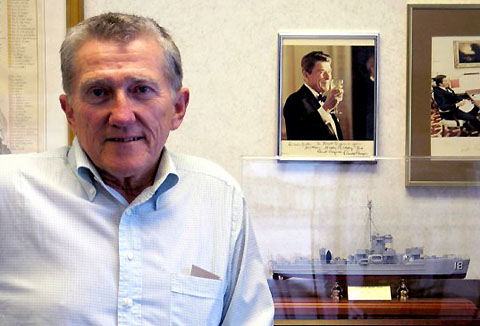 image above: ex Navy Secretary Lehman in office with model of WW2 warship on which he served