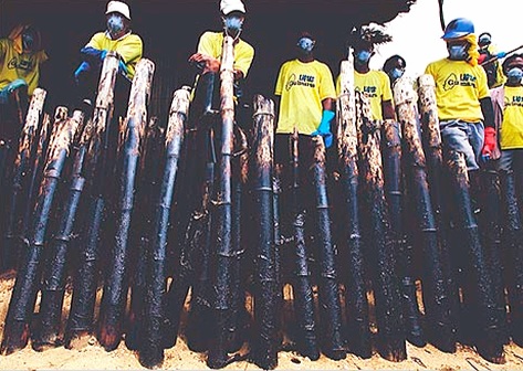 image above: Bunker fuel cleanup workers behind soiled bamboo fence in Nueva Vale, Guimaris