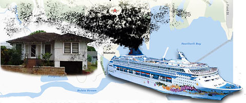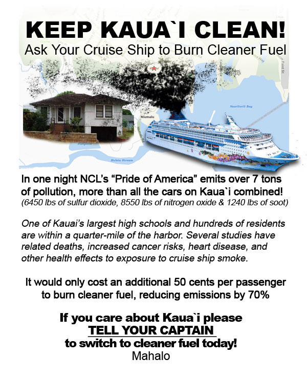 | by Dan Hempey on 24 May 2008 Hi All. Dan reporting from Kokee with a big flu. I just read in the Garden Island News The state Legislature last session deferred a bill proposing a three-year pilot program to determine the level and environmental impact of air pollution caused by bunker-fuel burning in cruise vessels docked or moored at Nawiliwili Harbor. “Frankly, I’m concerned that Norwegian Cruise Lines wasn’t more cooperative,” Hooser said. “Why do we get dirtier standards than California?” Anyway, I raised this before in another context. Why doesn't Kauai County limit these bunker fuel emissions, by Ordinance? They can, if they want. See below.