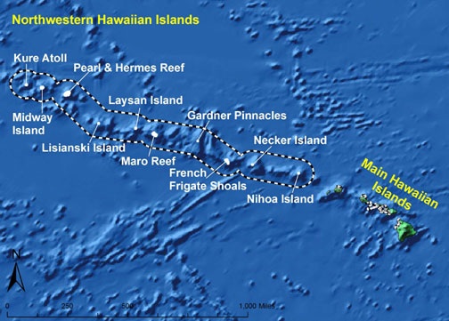 image above: Map of the Northwest Hawaiian Islands from the Marine Conservation Biology Institute