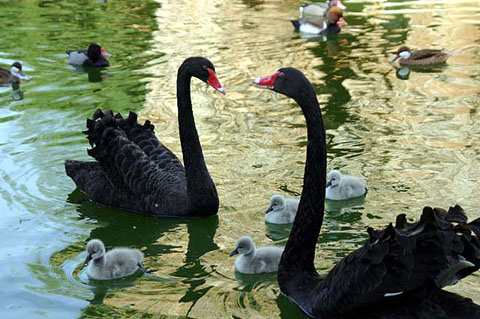 image above: a pair of black swans with chicks