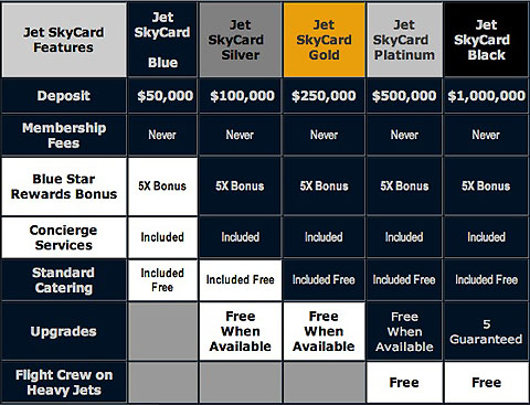 Five levels to match your personal and business private jet travel needs each card level offers special charter jet services on Blue Star Jets, including free upgrades allows you to extend available SkyCard flight privileges to anyone in your family or company one SkyCard is all that you need for any private jet flight your own personal travel consultant personal concierge to assist with travel, dining and entertainment needs The SkyCard program has: