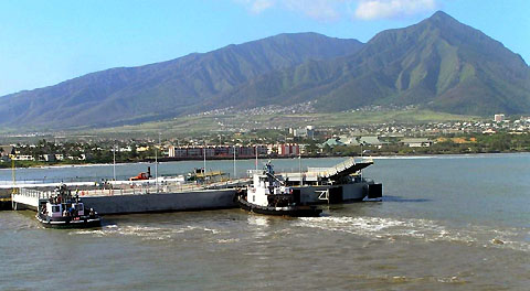 image above: tugs adjusting Superferry barge ramp in Kahului Harbor at $5,000 a day cost