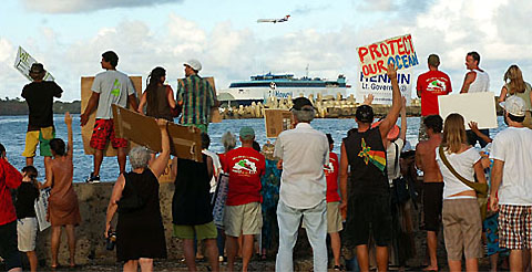 image above: Protests on 8/27/07 in Nawiliwili Harbor as Superferry approached. By Dennis Fujimoto