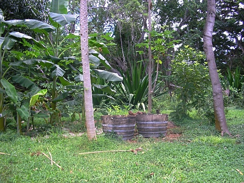 image above: whiskey barrel planters with papayas, bananas, avacado and sissel in background