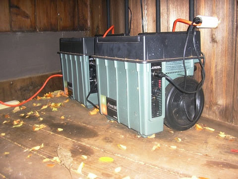 image above: two 60watt arrays of solar panels on near flat roofThese panels feed into three Xantrex Technologies 802-1500 XPower 1,500-Watt Portable Backup Power Systems. Each is a deep cycle battery, which stores 60 amp-hours of charge and has a built in inverter for AC current. The unit is sealed, has a handle and two wheels for some real mobility and flexibility.