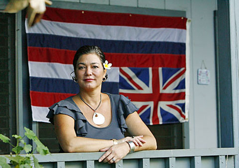 image above: Ka'iulani Edens Huff with "distressed" Hawaiian flag. Photo by David Allio for LA Times