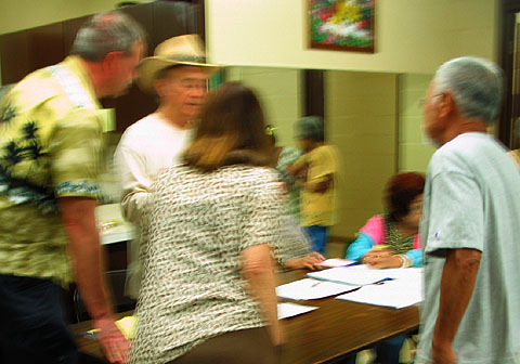 Adding to the confusion was the fact that three separate precincts were scheduled to meet in one room no larger than a classroom. In 2004, the Hanapepe precinct met alone at the Hanapepe Recreation Center. The room there had only five balloters and was several times as large as at Kaumakani.