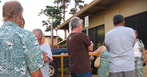 image above: A long line developed outside Kaumakani Senior Center. Photo by Juan Wilson
