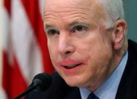 image above: John Mcain with scar. The make-up was applied by Juan WilsonIt's a rather sickening marketing ploy, made even more contemptible by McCain's choice of VP, not someone of sharp political acumen who will challenge his decisions and offer insight and inspire confidence, but Sarah Palin, former mayor of a piddling, eyeblink of a pee-stop town in rural Nowheresville, a shrill woman of zero political accomplishment clearly brought on board to lure both confused white women and the hard evangelical right, a minor state governor who thinks Creationism is dandy and who just got her first passport in 2007 and who would happily pass a law to force your daughter to have the baby if she'd been raped. Charming.
