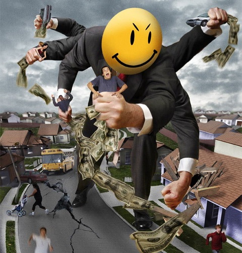 Of course, Wal-Mart, rather than actually improve its policies, instead spent millions to make itself merely look friendlier, touting all the (low-paying, often part-time, generally miserable) jobs they bring in to a community, and gosh, just look how happy those cashiers seem to be, and never you mind the vague threats that if anyone tries to unionize, a pale army of sexless managers will follow you home and kill you in your sleep with this 20-pound tub of cheese-coated popcorn. Mmm, wholesome.
